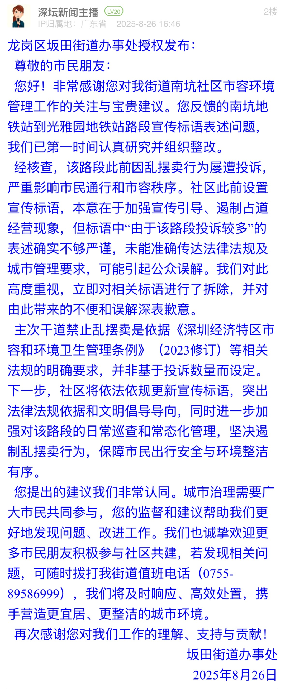 案例點評:標語表述不嚴謹可能引發(fā)公眾誤解,坂田街道辦展現(xiàn)出高效務(wù)實的態(tài)度,第一時間拆除涉事標語,計劃更新標語,明確標語中提及的禁擺依據(jù)為法規(guī)要求而非投訴數(shù)量?;貞?yīng)中,街道主動致歉并公開整改邏輯,展現(xiàn)“直面問題不推諉”的擔(dān)當,更以“邀請市民參與共建”為切入點,構(gòu)建“政府主導(dǎo)+公眾監(jiān)督”的治理閉環(huán)。此次整改有效化解因標語表述不當引發(fā)的公眾疑慮,彰顯了“以民為師”的共治智慧。