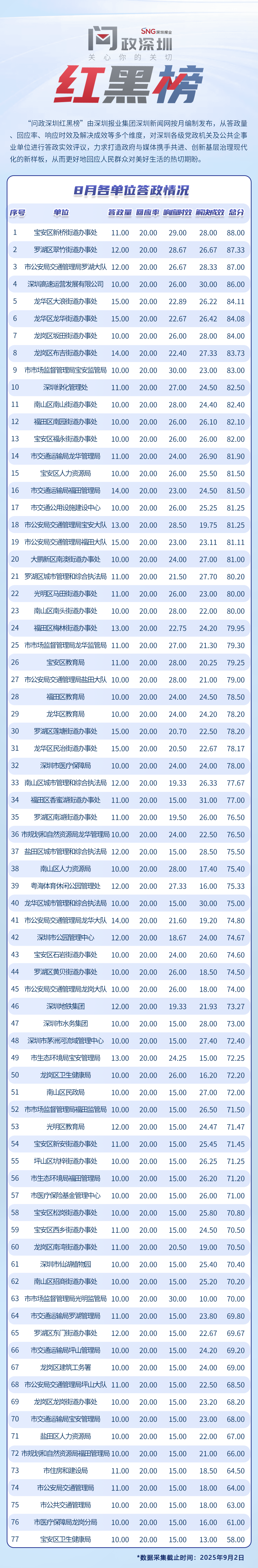 為探尋媒體如何精準賦能基層治理現(xiàn)代化的“深圳路徑”,深圳報業(yè)集團正式掛牌成立“問政深圳”工作室,旨在進一步推動網(wǎng)絡(luò)問政工作的高效開展。為確保相關(guān)工作更加契合實際需求,自上期起,深圳報業(yè)集團深圳新聞網(wǎng)按照“最快速度辦結(jié)”的總體要求,將原有月度榜單創(chuàng)新升級為“問政深圳紅黑榜”,并對評分體系進行了細致優(yōu)化。該榜單從答政量、回應(yīng)率、響應(yīng)時效及解決成效等多個維度,對深圳各級黨政機關(guān)及公共企事業(yè)單位進行答政實效評議,力求打造政府與媒體攜手共進、創(chuàng)新基層治理現(xiàn)代化的新樣板,從而更好地回應(yīng)人民群眾對美好生活的熱切期盼。