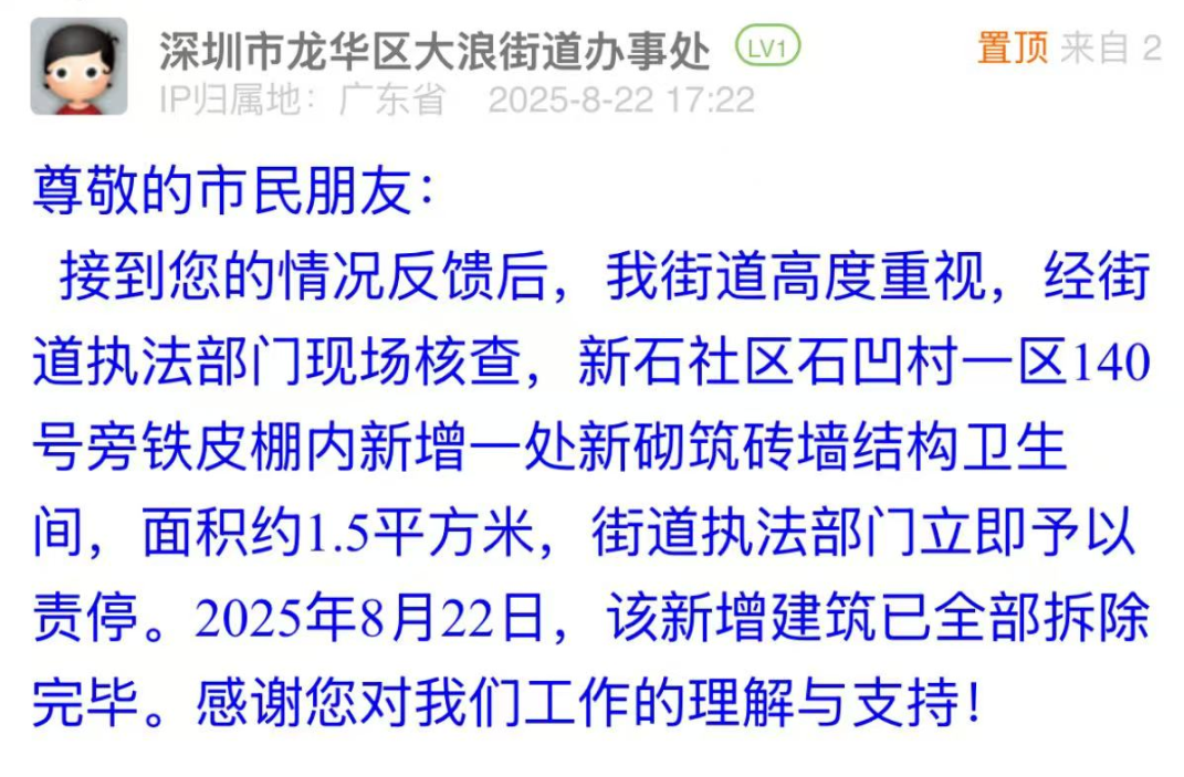 案例點評:8月21日晚間,市民發(fā)布帖文反映違建問題,大浪街道以“雷霆處置”展現(xiàn)安全至上的治理擔(dān)當。接到投訴后,街道迅速核查,在22日給出回應(yīng),表示已完成拆除工作,做到了“速辦速結(jié),質(zhì)效雙優(yōu)”。此次響應(yīng)既體現(xiàn)“隱患即事故”的底線思維,更以“發(fā)現(xiàn)即拆除”的高效行動,彰顯基層治理對民生安全的敏銳感知與果斷處置能力,切實筑牢居民“身邊安全”防線。