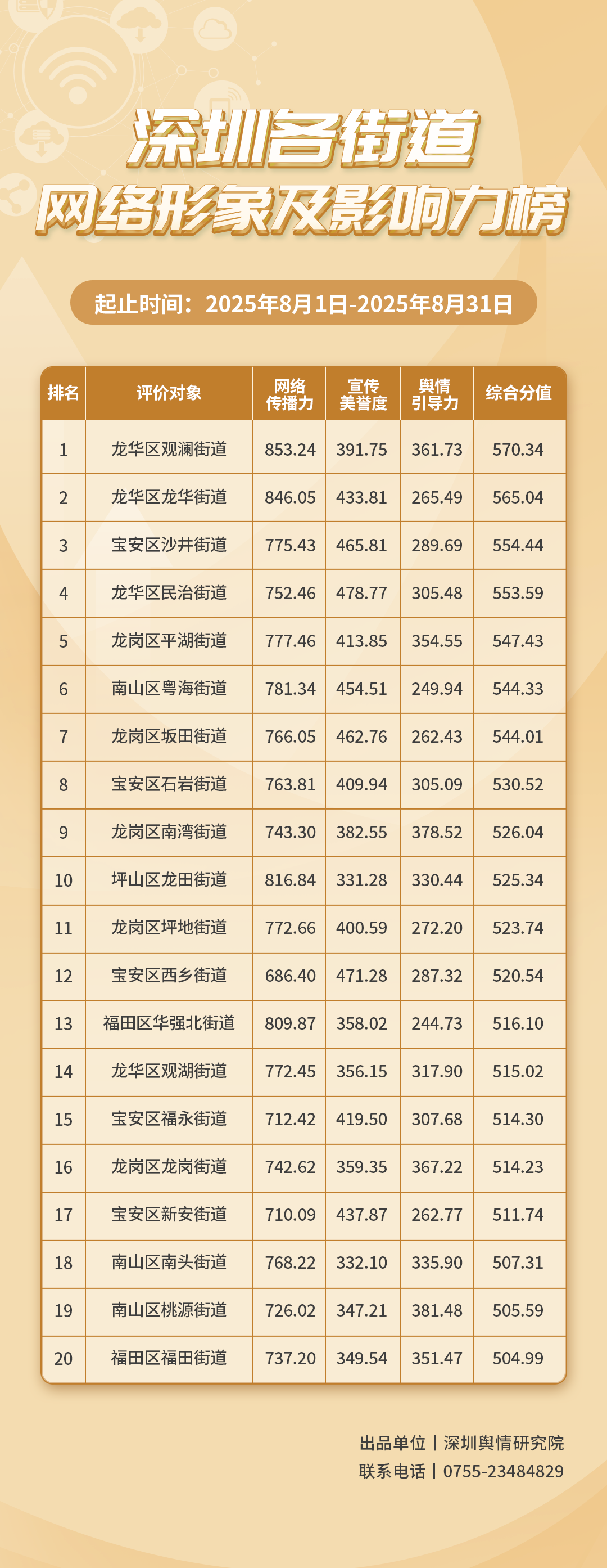 2025年8月,共有20個街道登上《深圳各街道網(wǎng)絡(luò)形象及影響力榜》,分別是:龍華區(qū)觀瀾街道、龍華區(qū)龍華街道、寶安區(qū)沙井街道、龍華區(qū)民治街道、龍崗區(qū)平湖街道、南山區(qū)粵海街道、龍崗區(qū)坂田街道、寶安區(qū)石巖街道、龍崗區(qū)南灣街道、坪山區(qū)龍?zhí)锝值?、龍崗區(qū)坪地街道、寶安區(qū)西鄉(xiāng)街道、福田區(qū)華強北街道、龍華區(qū)觀湖街道、寶安區(qū)福永街道、龍崗區(qū)龍崗街道、寶安區(qū)新安街道、南山區(qū)南頭街道、南山區(qū)桃源街道、福田區(qū)福田街道。