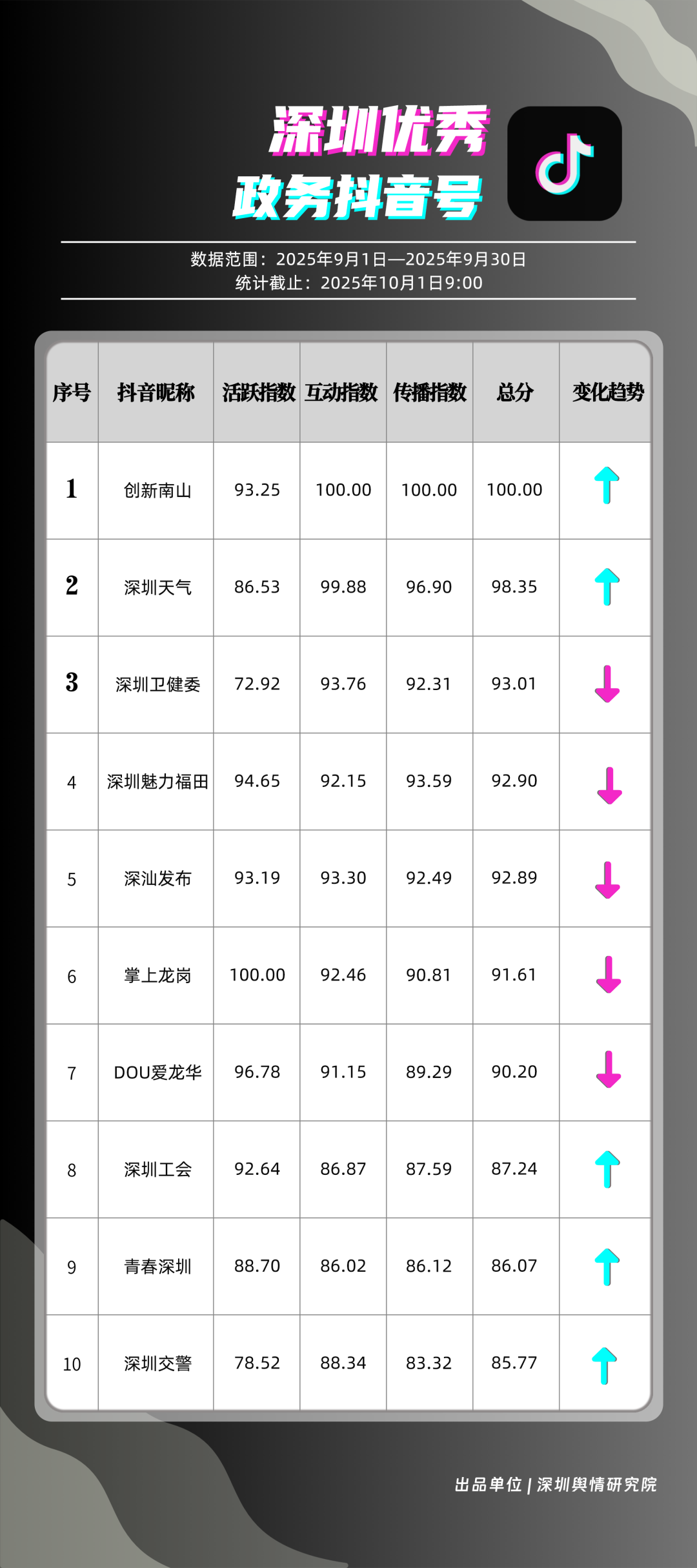9月,獲得“優(yōu)秀政務(wù)抖音號(hào)”稱號(hào)的是“創(chuàng)新南山”“深圳天氣”“深圳衛(wèi)健委”“深圳魅力福田”“深汕發(fā)布”“掌上龍崗”“DOU愛龍華”“深圳工會(huì)”“青春深圳”“深圳交警”?!皠?chuàng)新南山”以一條有關(guān)“青春不被年齡限定”的視頻獲得超34萬(wàn)次轉(zhuǎn)發(fā),超14萬(wàn)次點(diǎn)贊,助力其在抖音榜單居于榜首;“深圳天氣”多條臺(tái)風(fēng)相關(guān)視頻吸引大量網(wǎng)民關(guān)注、互動(dòng),在抖音平臺(tái)得分超98分;“深圳衛(wèi)健委”“深圳魅力福田”“深汕發(fā)布”等賬號(hào)緊隨其后,得分均在92分以上。上榜的優(yōu)秀政務(wù)抖音號(hào)以“有溫度”的敘事表達(dá),將宣傳、服務(wù)內(nèi)容轉(zhuǎn)化為網(wǎng)民喜聞樂見的視頻,收獲高點(diǎn)贊、高轉(zhuǎn)發(fā)的流量實(shí)績(jī),更在評(píng)論區(qū)形成了良性互動(dòng)生態(tài),深度運(yùn)營(yíng)收獲了較好成果。