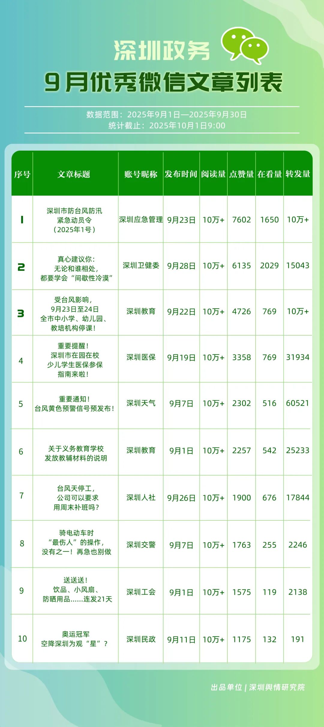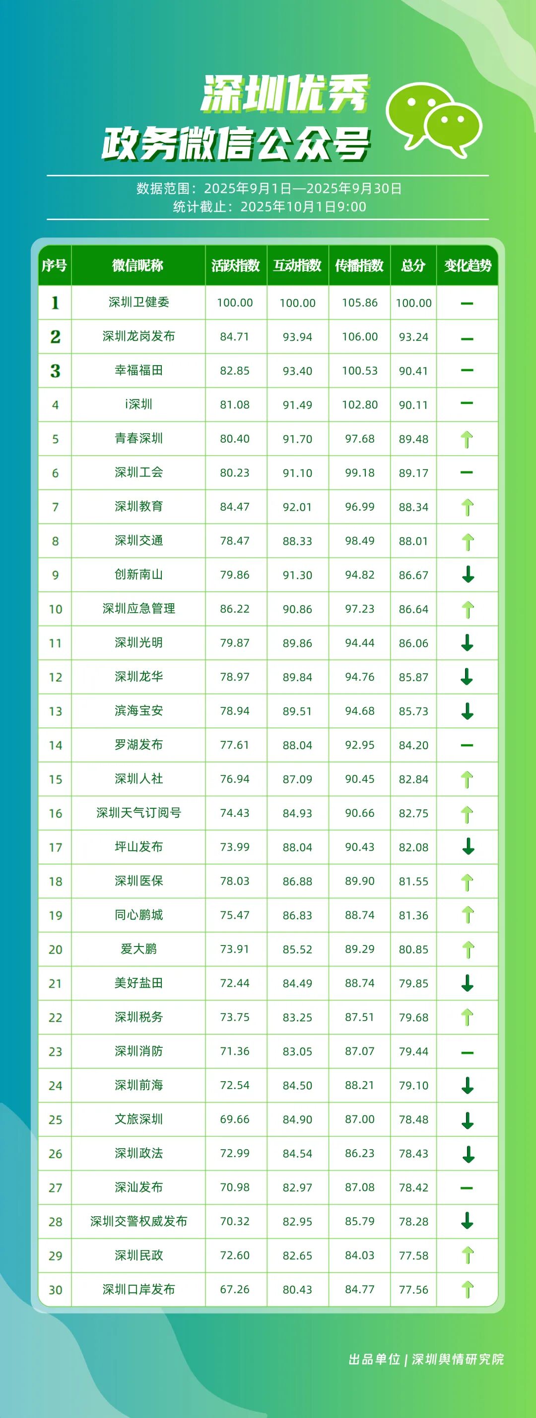 9月,“深圳衛(wèi)健委”“深圳龍崗發(fā)布”“幸福福田”“i深圳”“青春深圳”“深圳工會(huì)”“深圳教育”“深圳交通”“創(chuàng)新南山”“深圳應(yīng)急管理”等30個(gè)政務(wù)微信公眾號(hào)榮登“深圳優(yōu)秀政務(wù)微信公眾號(hào)”榜單。9月,“深圳衛(wèi)健委”以總分100.00的成績(jī)蟬聯(lián)榜單首位,其憑借突破常規(guī)視角的選題,解讀專業(yè)健康知識(shí),引發(fā)大量網(wǎng)民共鳴,內(nèi)容質(zhì)量與傳播力形成雙向賦能;“深圳龍崗發(fā)布”以總分93.24位居第二,聚焦區(qū)域民生服務(wù)升級(jí)等動(dòng)態(tài),信息觸達(dá)率不斷提升;“幸福福田”圍繞商圈經(jīng)濟(jì)復(fù)蘇、文化節(jié)慶活動(dòng)等主題開展系列宣傳,增強(qiáng)區(qū)域活力展示,位列第三;“i深圳”“青春深圳”“深圳工會(huì)”等也持續(xù)優(yōu)化賬號(hào)內(nèi)容,通過(guò)實(shí)用信息推送強(qiáng)化政務(wù)服務(wù)定位。
