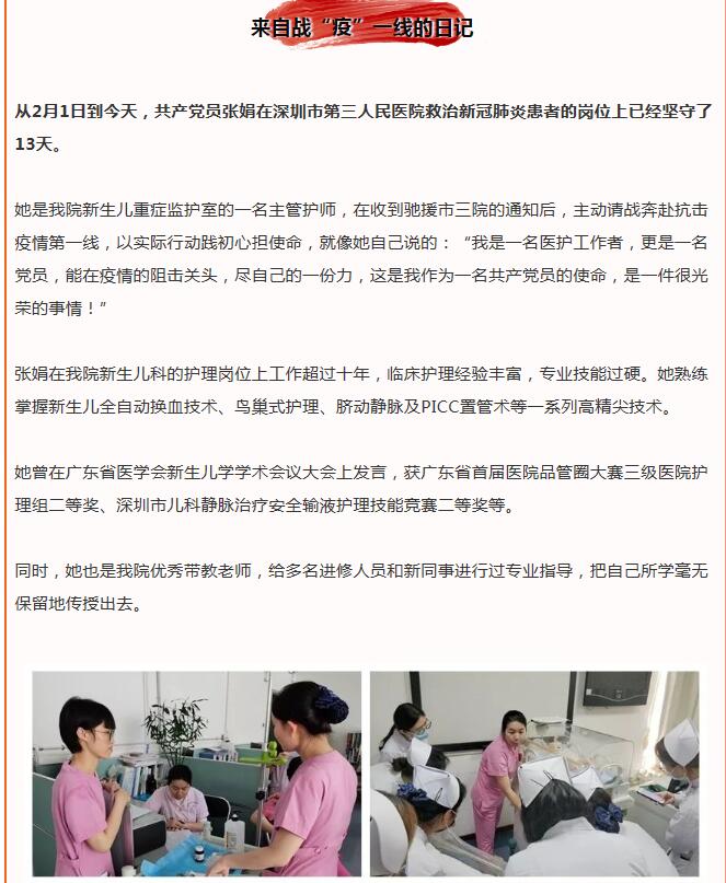 賴碧娟是深圳市婦幼保健院急診黨支部書記、急診科護(hù)士長。作為一名老黨員,抱著“疫情快些得到控制,最大程度減少損失”的信念,新冠肺炎疫情期間,她帶頭沖在一線,整個(gè)春節(jié)期間基本都在醫(yī)院加班?!拔覀兗痹\科全體黨員和醫(yī)護(hù)人員都嚴(yán)陣以待。只要有需要,所有人都沖在一線。”